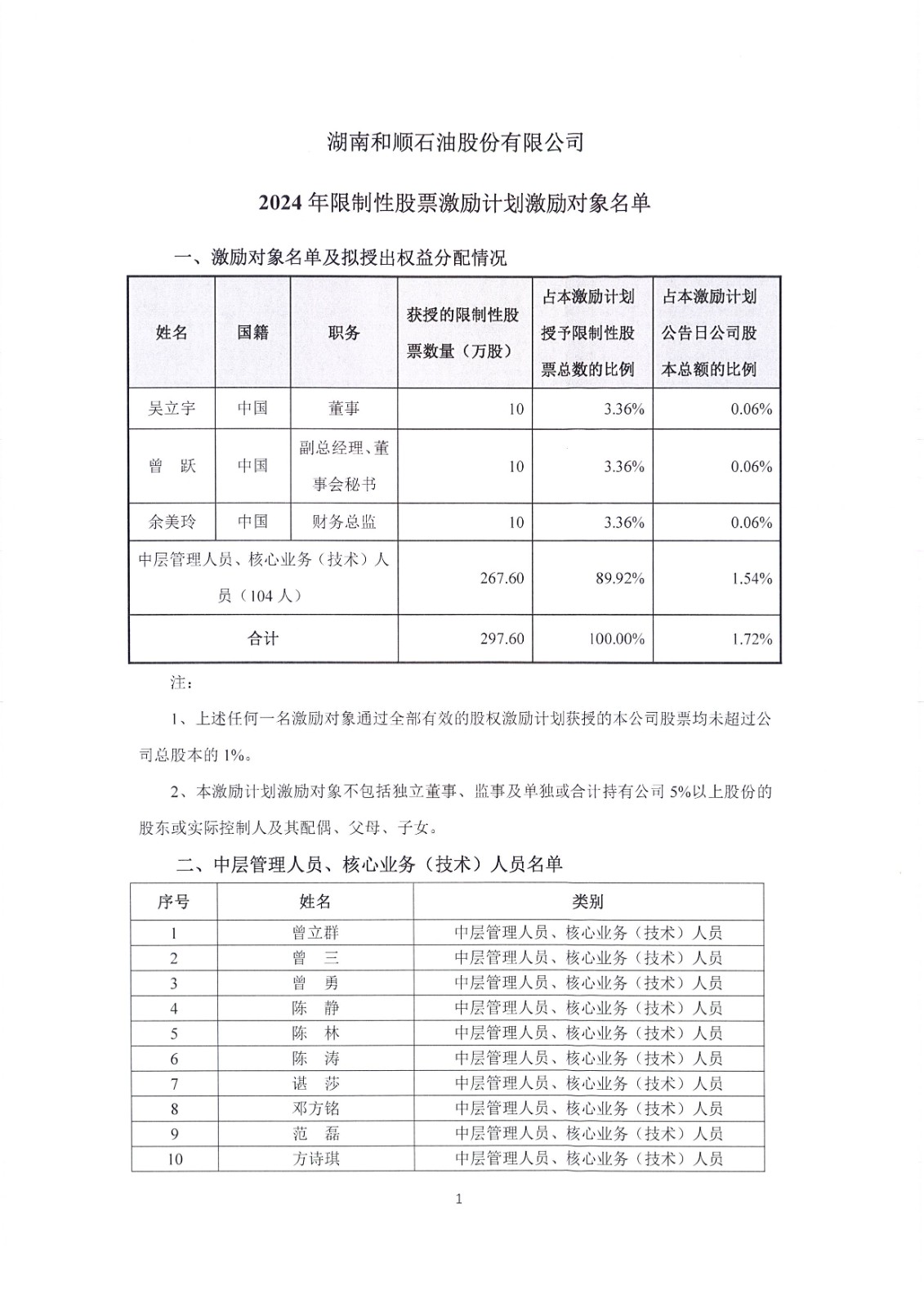 湖南和順石油股份有限公司(以下簡稱“公司”)于2024年4月25日召開第三屆董事會第九次會議和第三屆監(jiān)事會第八次會議,審議并通過《關(guān)于公司<2024年限制性股票激勵計劃(草案)>及摘要的議案》等相關(guān)議案。根據(jù)中國證券監(jiān)督管理委員會《上市公司股權(quán)激勵管理辦法》的有關(guān)規(guī)定,公司對2024年限制性股票激勵計劃激勵對象的姓名和職務(wù)進(jìn)行如下公示,公示期為2024年4月30日至2024年5月9日,共10天。在公示期間,對公示對象有異議的,可經(jīng)書面郵件形式向公司監(jiān)事會反映,接收郵箱為:pengmujun@hnhsjt.com。