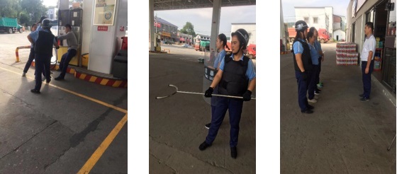 搶險(xiǎn)組的加油員分工明確:一隊(duì)加油員手持鋼叉等防爆工具迅速前來(lái)支援,與歹徒對(duì)峙。另一隊(duì)加油員用消防沙將噴灑在地面的油品覆蓋,并備好滅火器隨時(shí)準(zhǔn)備噴射滅火。