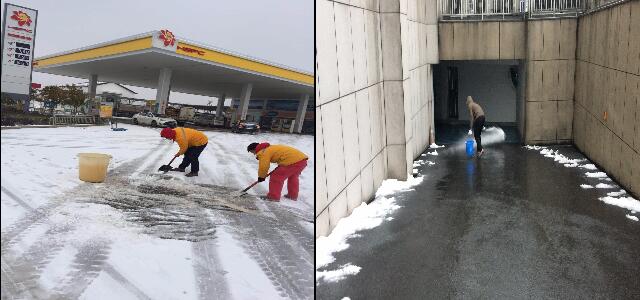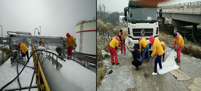 寒風(fēng)中,油庫一線員工為維護(hù)正常卸、發(fā)油而冒雪工作,檢查設(shè)施設(shè)備狀態(tài);物流車隊(duì)司機(jī)們風(fēng)雪無阻,排除困難,按時按點(diǎn)將油品安全送達(dá)客戶、送到各站點(diǎn);各個加油站基層員工通力合作,掃除油站積雪,保障油站進(jìn)出通道順暢通行和行車安全;總部行政、物業(yè)人員也及時給辦公樓前坪進(jìn)行掃雪、除冰,為行政辦公工作保駕護(hù)航。